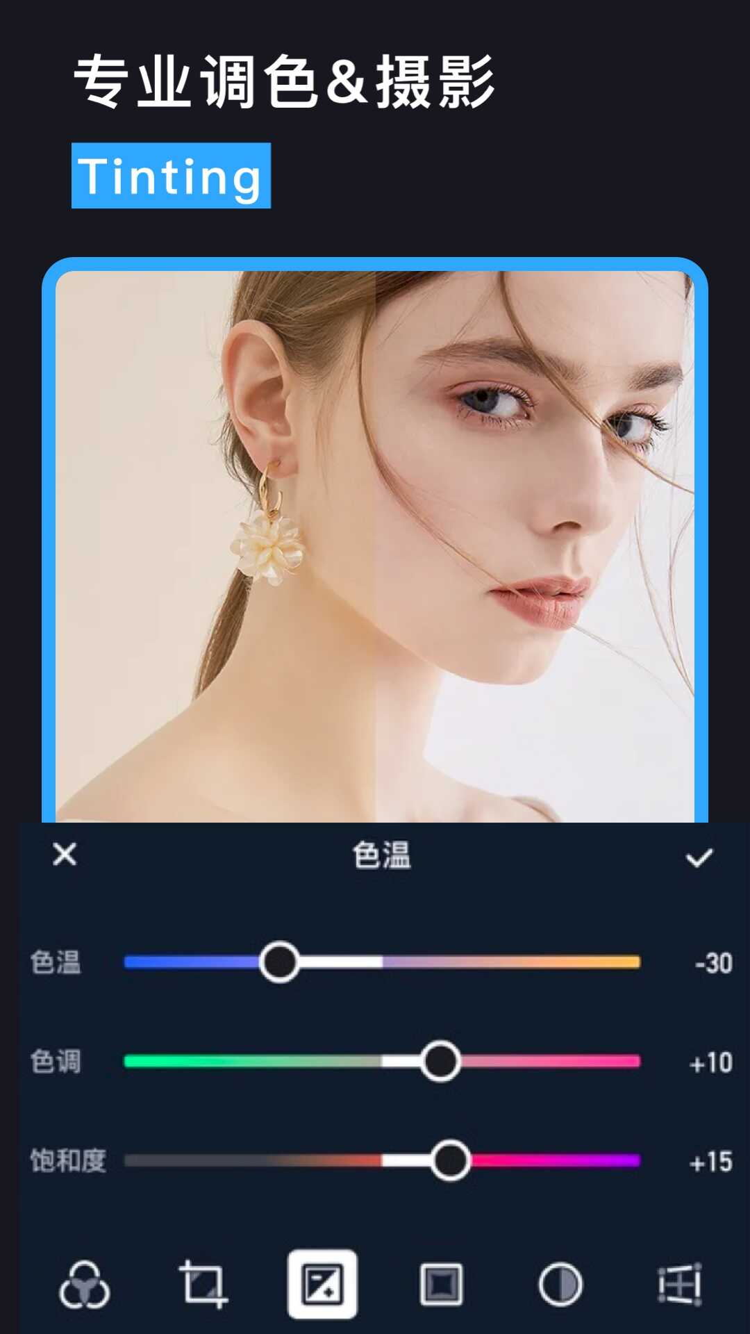 支持多种高级编辑调节工(gong)具(ju):亮度,饱和度,曝光度等,释放p图。创意专业编辑工(gong)具(ju)几十种超梦幻图片叠加滤镜特效:经典,华丽,优雅,回忆(huiyi),复古等。