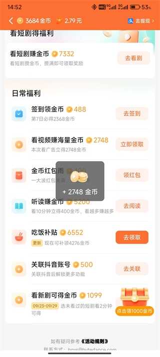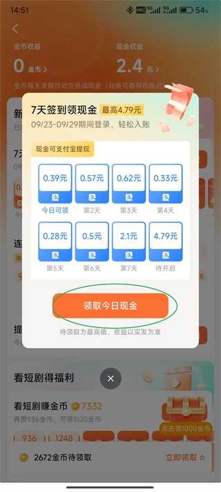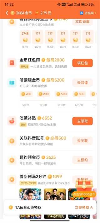 4、每天看剧达到一定时间可以获得金币,累积到一定数额就能体现,新人朋友还有七天签到福利