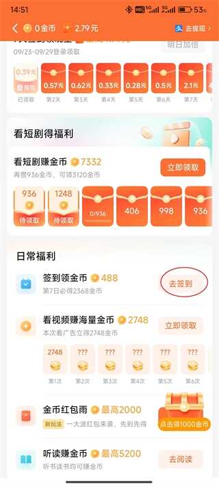 4、每日签到也可以领取到“金币”,点击屏幕右侧“日常福利”板块的的“去签到”。
