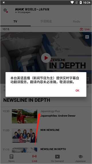 4、在“live”模板中需注意的是本台英文直播新闻节目为主,因此提供的是实时字幕自动翻译服务