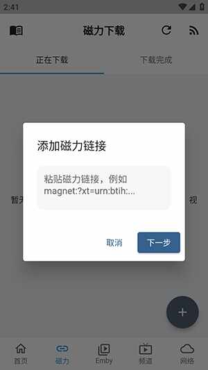 1、点击磁力板块,点击右下角的加号添加磁力链接。