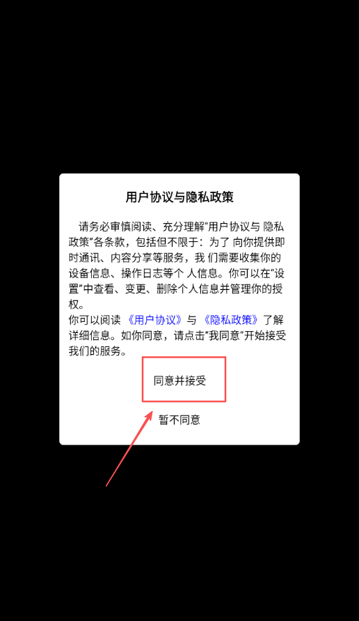 1、打开后会看(kan)到软件协议,点一下同意,不然没法继续往下用软件的功能哦。