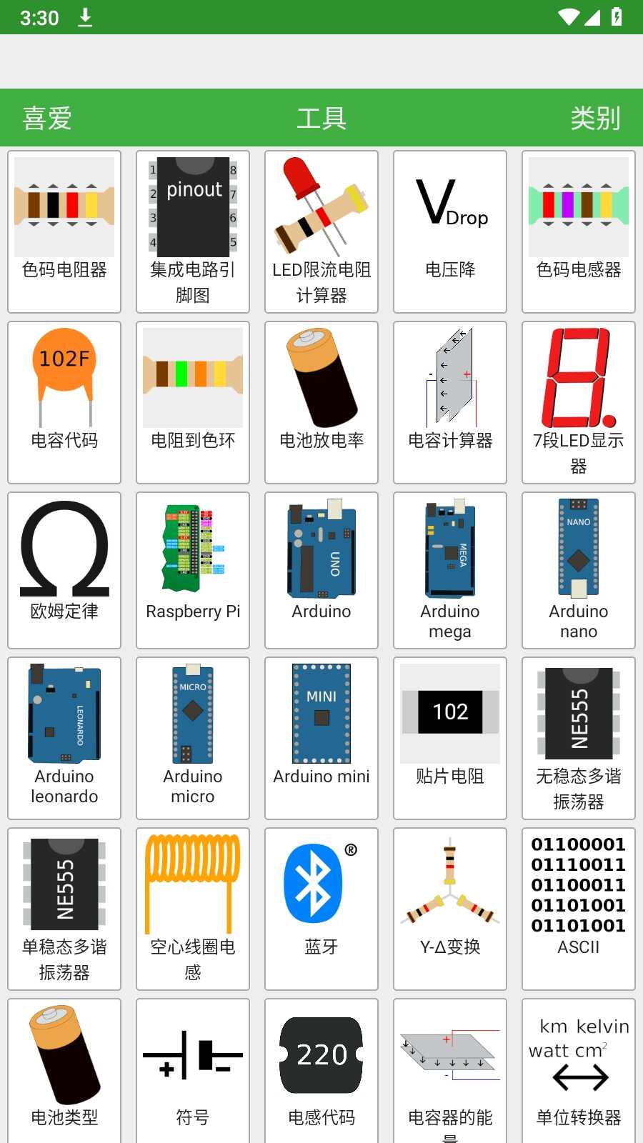 色环电阻识别,色环电感识别,阻值转色环,贴片电阻识别,电容值代码,电感代码,熔断器,电阻求总,电容求总,lc谐振频率计算,电阻分压电路,分流器,稳压二极管稳压电路,分压电阻,led限流电阻,电池寿命,变压器初级/次级绕组,天线长度计算,闭路电视硬盘驱动器/带宽计算。