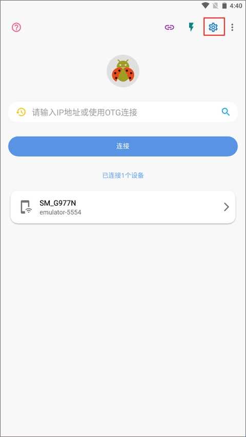 (1)打开甲壳虫adb手机助手app,并点击右上角的“设置”按钮进入到设置选项界面。