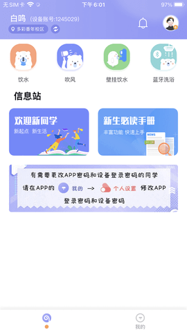 3. 选择服务在首页选择所需的自助服务,如饮水、洗衣、淋浴或吹风,点击进入服务详情。