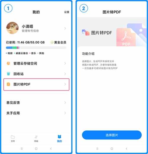 自动转换针对相册中的PPT图片,系统会自动识别并转为PDF;手动转换需进入云盘“我的”页面,点击“图片转PDF”,从相册选择需要转换的图片,确认后即可生成PDF文件,转换后的文件会保存在云盘内,方便随时查看。