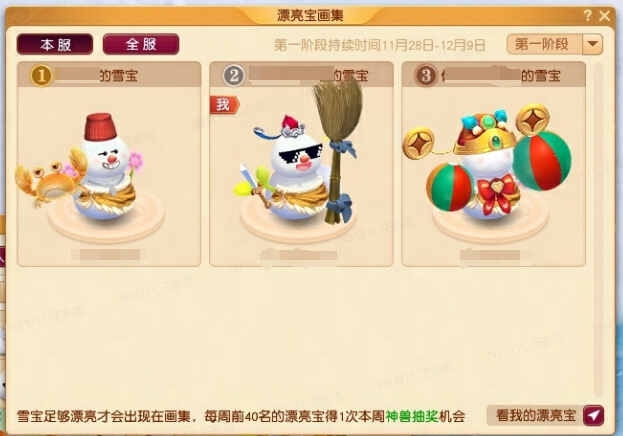 嘉年华漂亮宝评选共分4轮:2025年12月9日11:00、2025年12月16日11:00、2025年12月23日11:00姒彶2025年12月30日11:00为每(mei)个(ge)阶段的报名截止时间,圆福小和尚会评选每(mei)个(ge)阶段每台服务器的“漂亮宝”,在截止当日的12:00公布。不同阶段将会有不同的评选标准,部分装饰品也会在后续阶段相继投放。快去搜集装饰品,让你的雪宝变得独一无二吧!